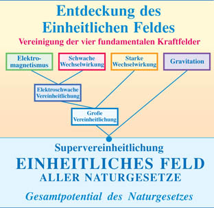 Insbesondere entdeckte man in der Physik, dass die bekannten dynamischen Wechselwirkungen in der Natur durch vier verschiedenartige fundamentale Kraftfelder verstanden werden können – die Kraftfelder der elektromagnetischen, der Schwachen und der Starken Wechselwirkung, sowie die Gravitationswechselwirkung (siehe Schaubild). Mit dem Fortschritt in den vereinheitlichten Quantenfeldtheorien erkannte man jedoch, dass diese verschiedenen Kraftfelder (sowie die verschiedenartigen Materiefelder) nur unterschiedliche Ausdrucksformen eines einzigen Einheitlichen Feldes sind, dem holistischen transzendentalen Feld, das allen verschiedenartigen manifesten Phänomenen in der Natur zugrunde liegt (siehe Schaubild).