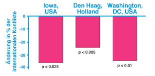 ![]() | Während drei Versammlungen von ca. 7000 Ausübenden des TM-Sidhi-Programms (was zu der Zeit etwa die Quadratwurzel aus einem Prozent der Erdbevölkerung war) wurde weltweit eine signifikante Abnahme internationaler Konflikte um bis zu 37% beobachtet |